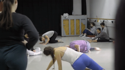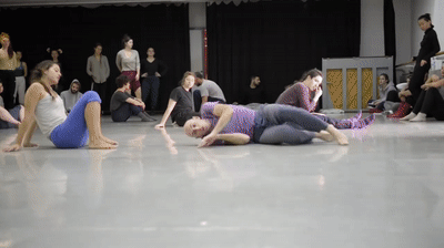 Floor Work-Technik beibehalten. Beinschwünge, Kauern, Strecken, hochkommen, Schulterstand, Oberkörper im Bogen dehnen, Gegenbewegungen beachten. Schwingen, Rollen und in den Boden arbeiten.